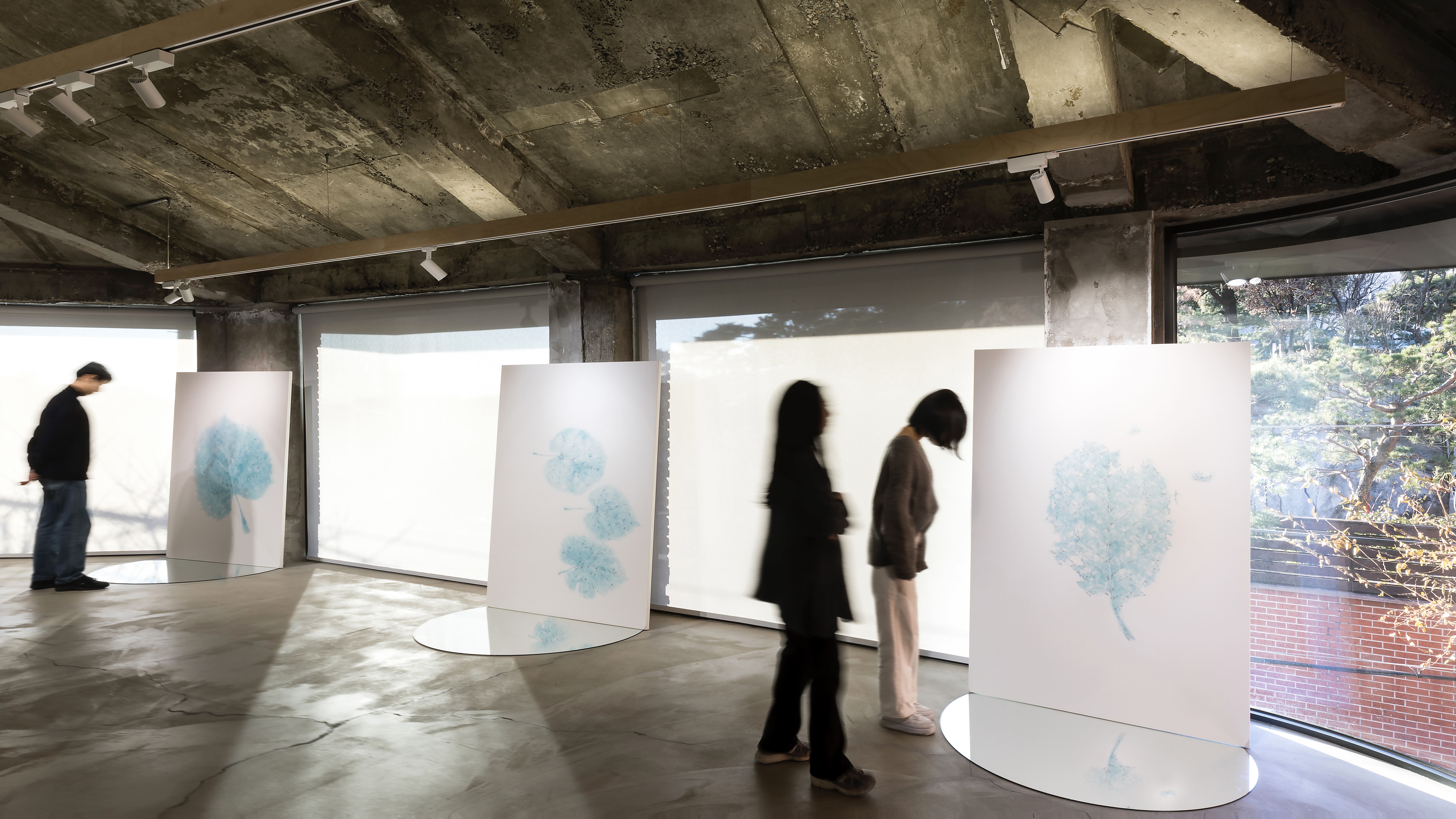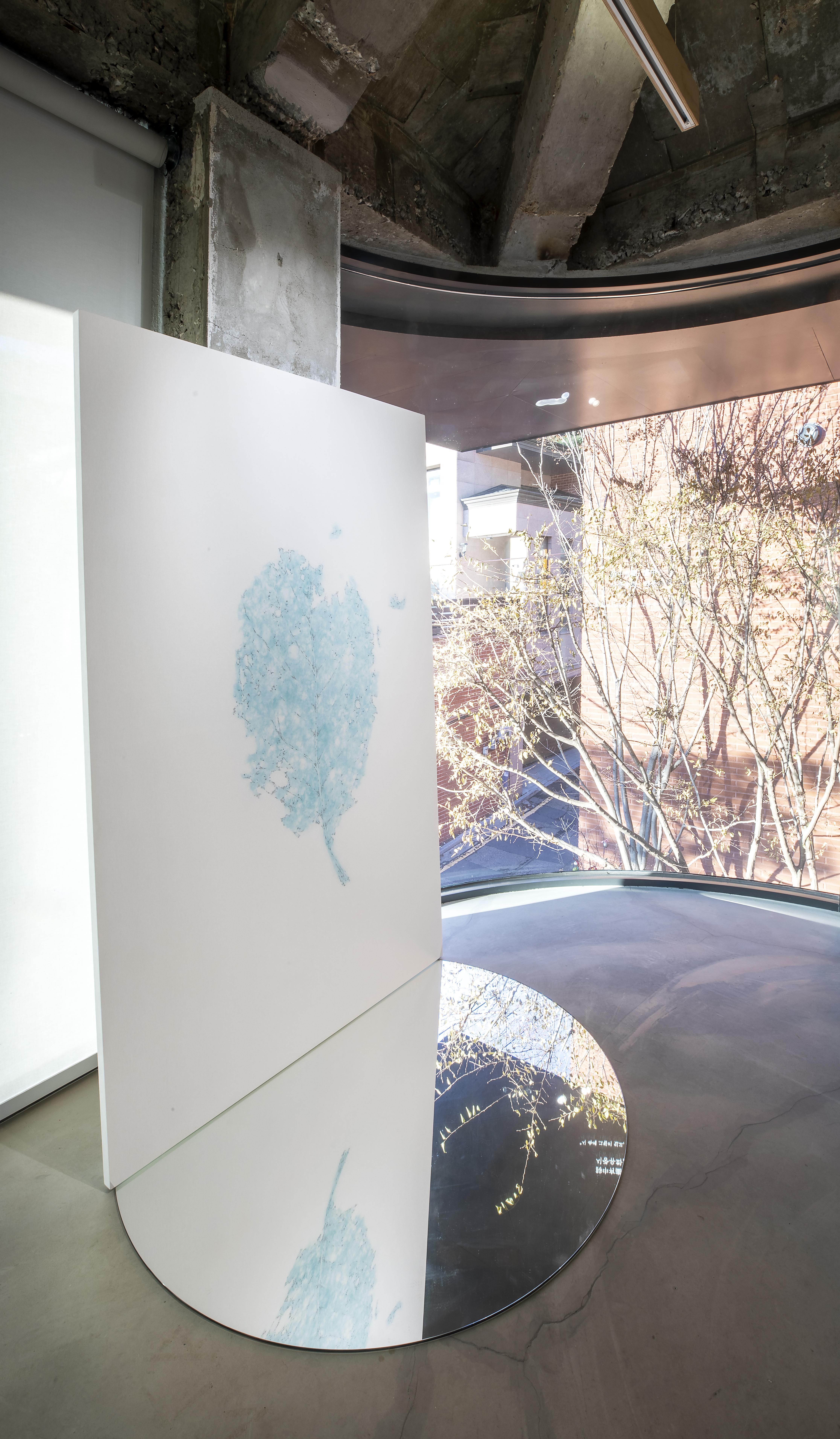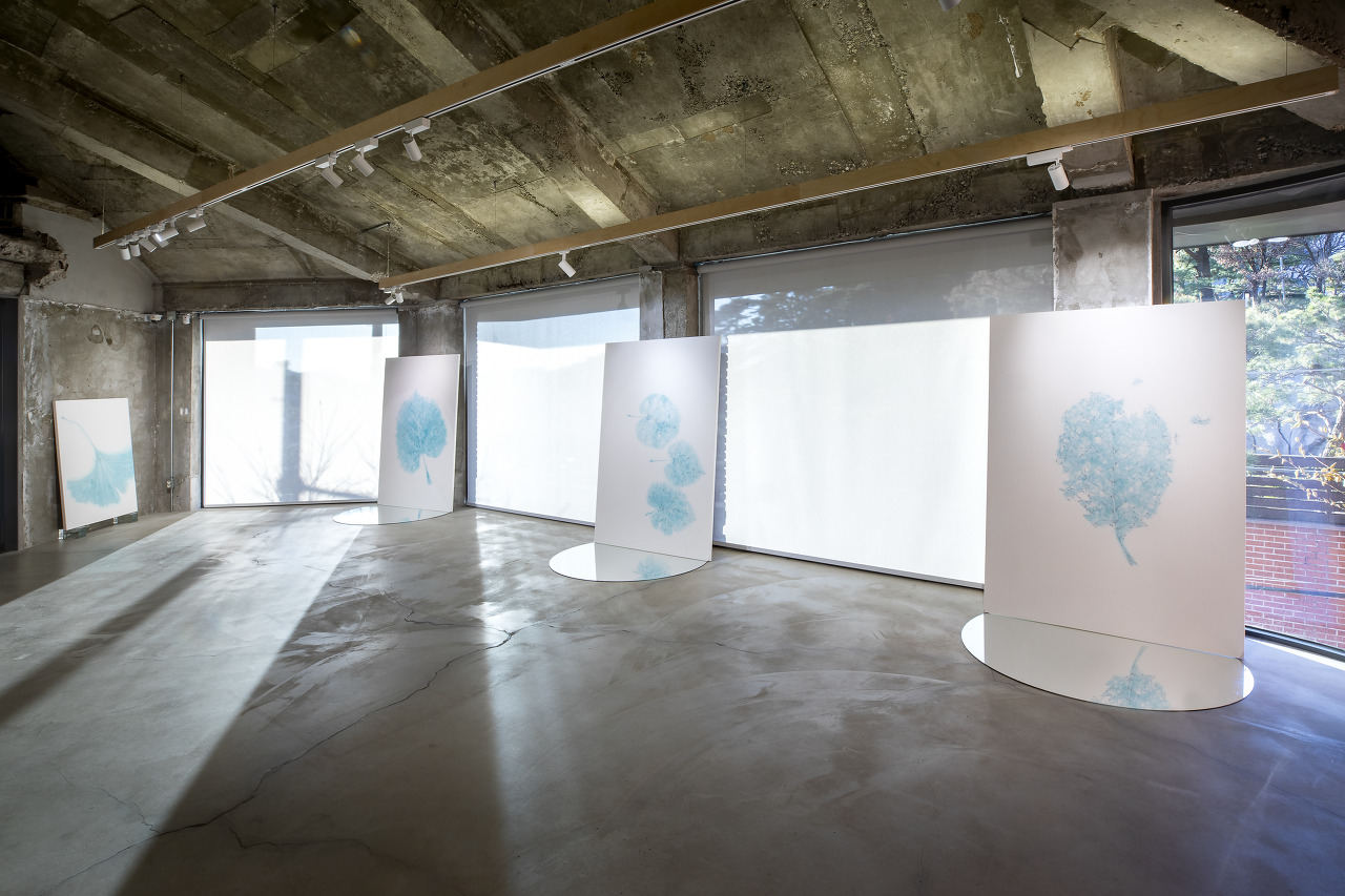 더 나아가 거울에 반전되어 떠오른 잎의 그림자, 관람하는 각도와 시선의 높낮이에 따라 푸른 생명의 에너지가 바람을 타고 생동하는 장면의 포착, 푸른 잎에 투영된 자화상과 함께 본인의 모습을 바라보는 관람객의 시선, 개인의 관념에 따라 다양한 감상이 발현되는 순간들을 상상하며 기획했다.