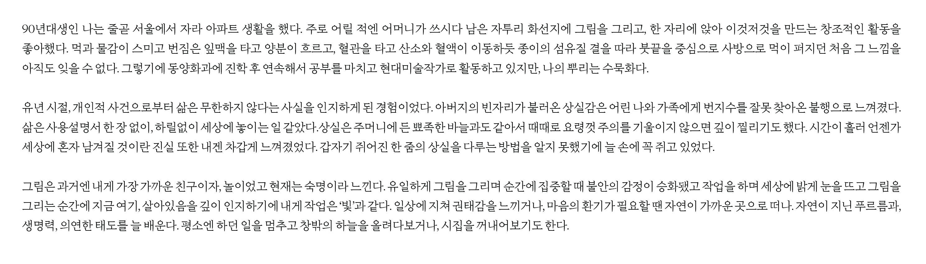 이번 전시에서 선보인 일상의 반짝이는 순간들의 모음을 통해, 꺼내어 보이거나 내려놓기 어려웠던 생각과 묵은 감정, 각자 내면의 아픔과 상처에게 작은 위안과 휴식, 치유의 에너지로 닿길 바라는 마음으로 따스한 빛 한 줌을 건네고 싶다.