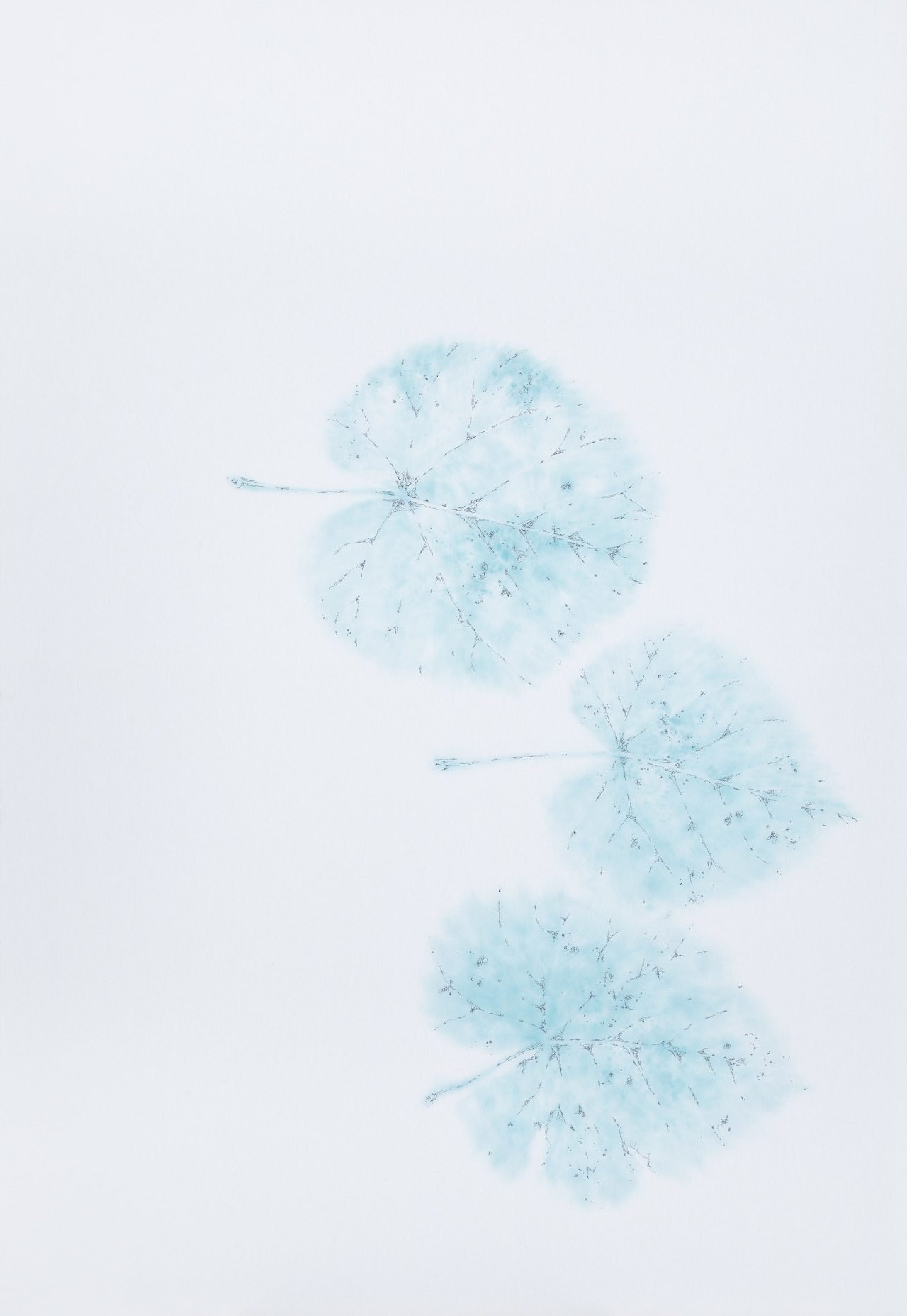 세월의 흔적으로 찢기고 구멍이 난 낙엽을 푸른 수묵으로 재현하고, 반짝이는 은실의 자수 표현으로 섬세한 잎맥과, 상처들을 집약적으로 강조했다. 소멸에 가까워져 일반적인 아름다움과 다소 거리가 있는 모습일지라도, 빛나는 생명력을 품고 있는 자연의 모든 존재는 아름답다. 이처럼 자연의 순환을 관찰하고 이해하다 보니 일상의 평범한 순간들이 내게 ‘시 詩’로 다가와❬Anthology : 삶의 조각❭시리즈가 탄생 되었다.