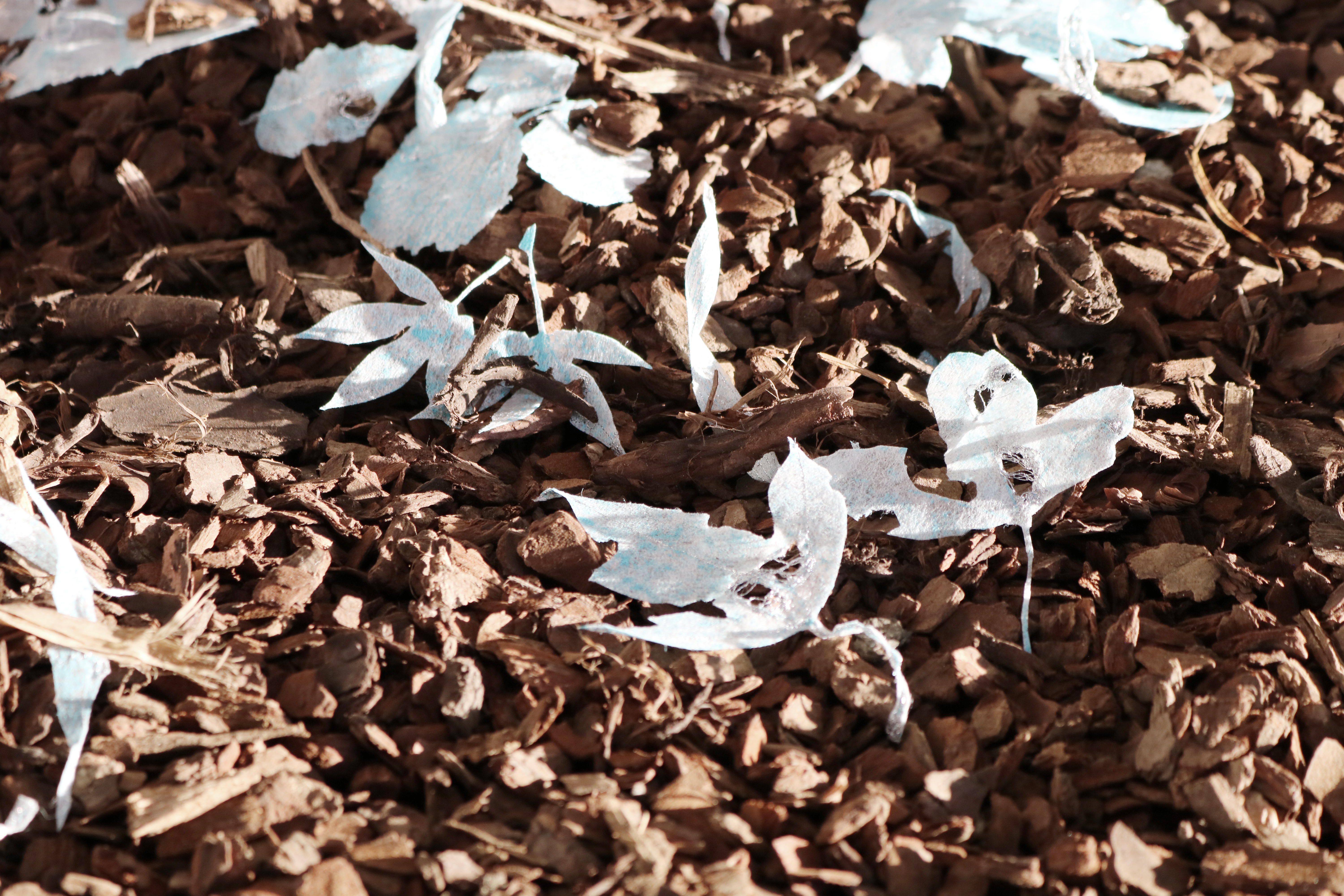 개체마다 뿌리를 내리고 있는 환경과, 다양한 요인으로 인해 모든 생명은 서로 다른 방식과 속도로 각자의 계절을 살아가기에 삶은 사용 설명서가 없다. 사철나무들도 일정의 시기마다 잎을 조금씩 내려놓고, 저마다 웅크림의 시간을 보낸다. 땅으로 떨어진 마른 잎들은 분해되고, 흩어진 낙엽의 조각들은 양분으로 흡수되어 다시 잎을 틔워낼 준비를 하며 생명의 에너지로 작용하는 것이 자연의 순리이다. 이와 같은 관점에서 삶의 흔적으로 구멍이 난 비정형적 이파리들에서 인간의 생生과, 사死가 동시에 파노라마처럼 비추어 보였다. 흙을 연상하게 하는 수피樹皮 조각들 위에 함께 설치된 잎의 조각은, 그동안 수집해 둔 낙엽과, 잎들을 스텐실 기법으로 본을 떠 구현했다. 비정형적 이파리의 찢김이나 벌레가 갉아 먹은 자국 등을 자연스러운 그대로 모습을 살려 오려낸 뒤 은실 자수로 상처에 반짝임을 부여한 작품이다.