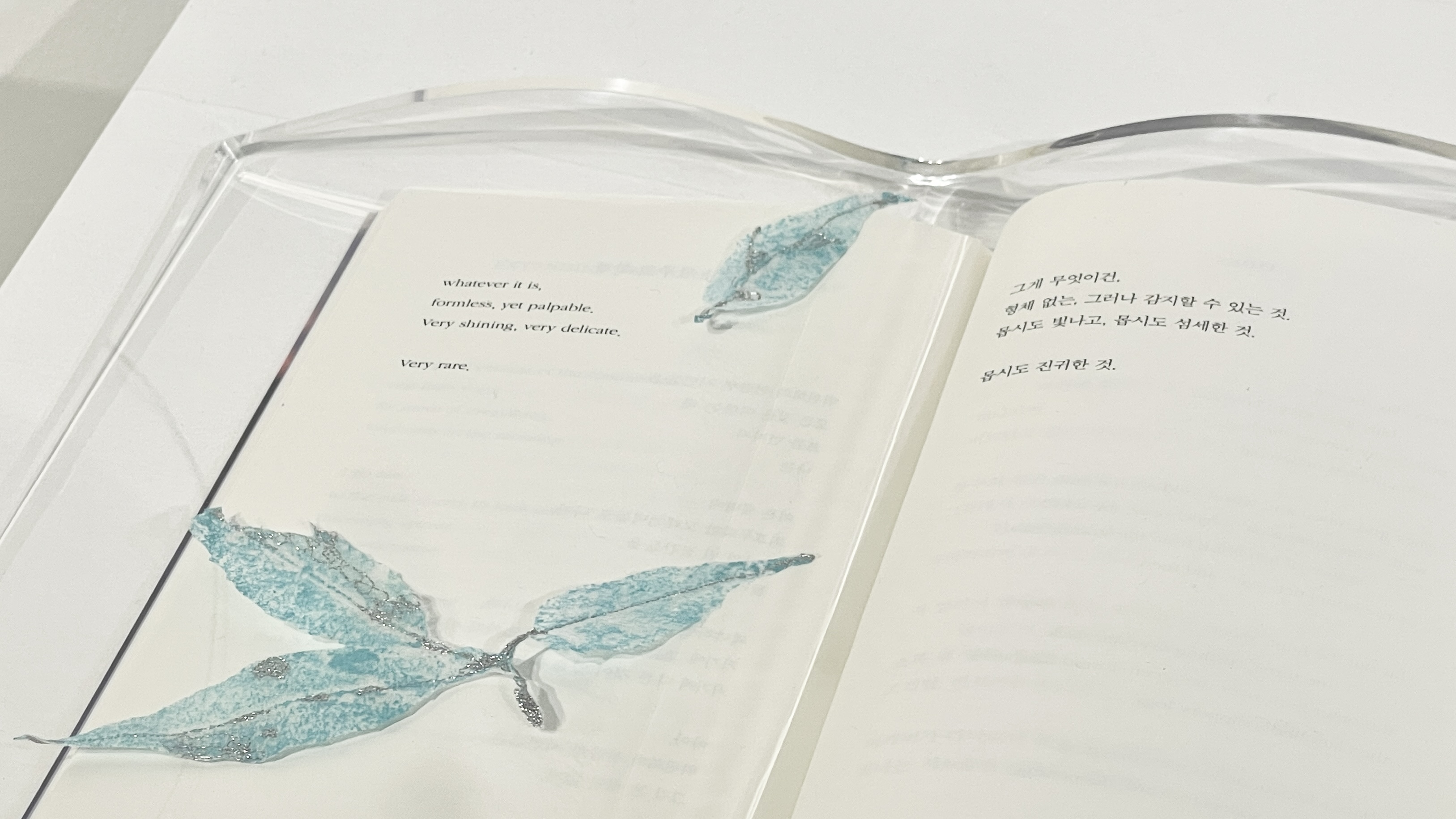 세월의 흔적으로 찢기고 구멍이 난 낙엽을 푸른 수묵으로 재현하고, 반짝이는 은실의 자수 표현으로 섬세한 잎맥과, 상처들을 집약적으로 강조했다. 소멸에 가까워져 일반적인 아름다움과 다소 거리가 있는 모습일지라도, 빛나는 생명력을 품고 있는 자연의 모든 존재는 아름답다. 이처럼 자연의 순환을 관찰하고 이해하다 보니 일상의 평범한 순간들이 내게 ‘시 詩’로 다가와❬Anthology : 삶의 조각❭시리즈가 탄생 되었다.
