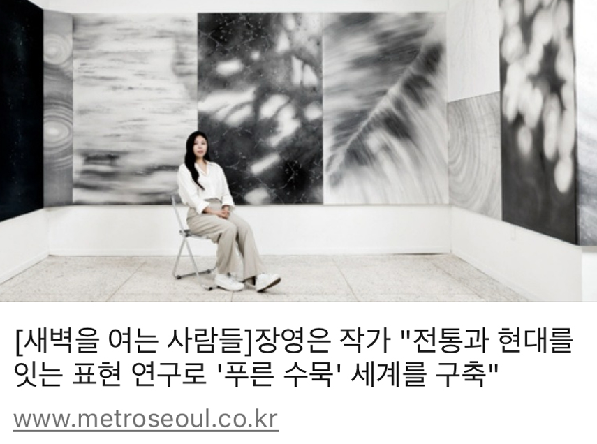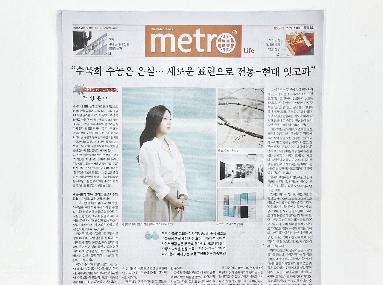 지난 5일 <메트로경제신문>은 장영은 작가의 개인전 '빛, 숨, 결 : LIGHT, BREATH, TRACE'이 열리는 서울 은평구 '공간루트'에서 그를 만났다. 1993년생의 젊은 작가는 '동양화를 기반으로 은빛 바느질 선을 중첩하는 수묵의 변주를 통해, 전통과 현대를 잇는 새로운 표현 연구로 '푸른 수묵'의 세계를 구축하고 있다'고 자신을 소개했다.