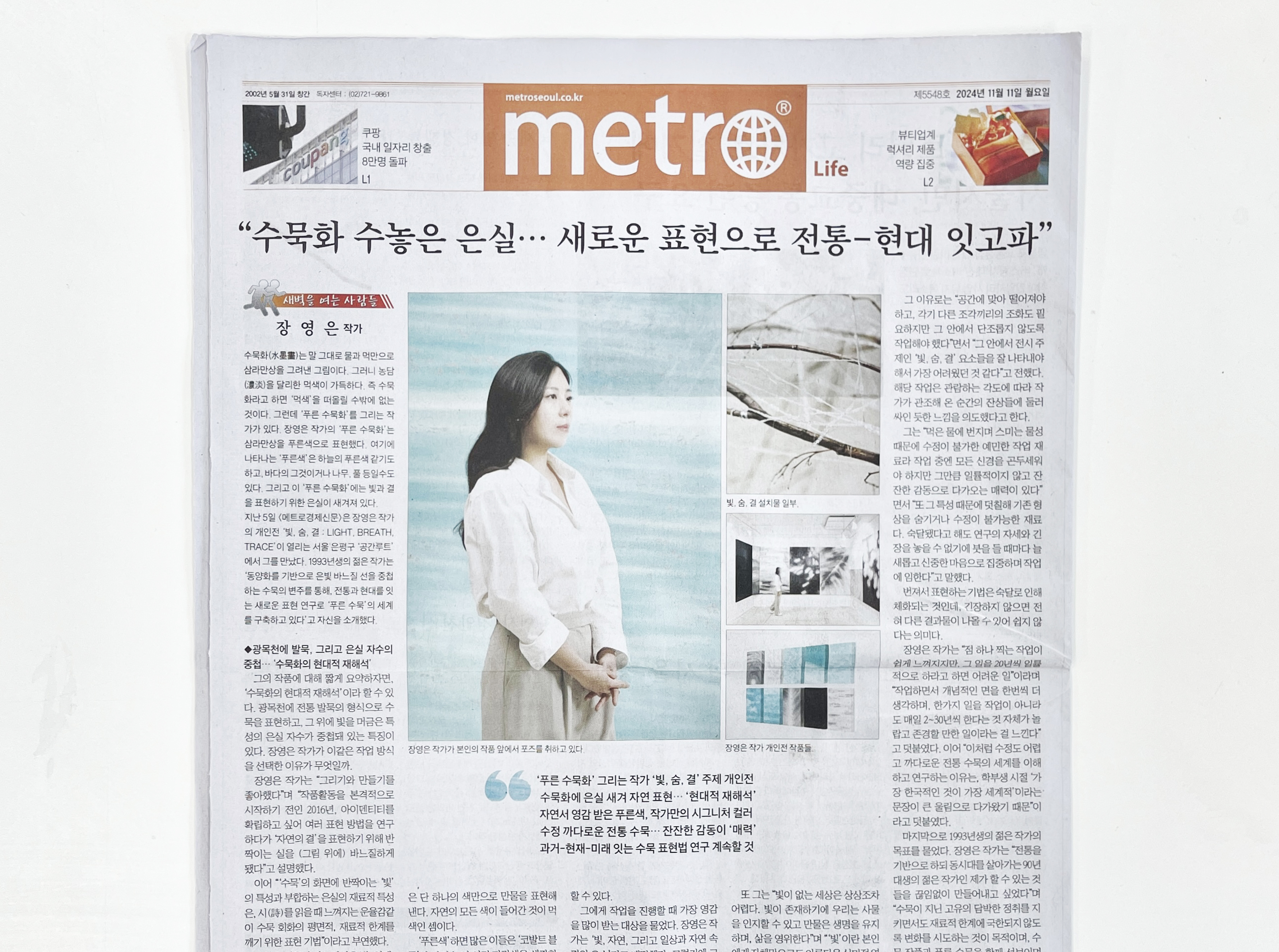 지난 5일 <메트로경제신문>은 장영은 작가의 개인전 '빛, 숨, 결 : LIGHT, BREATH, TRACE'이 열리는 서울 은평구 '공간루트'에서 그를 만났다. 1993년생의 젊은 작가는 '동양화를 기반으로 은빛 바느질 선을 중첩하는 수묵의 변주를 통해, 전통과 현대를 잇는 새로운 표현 연구로 '푸른 수묵'의 세계를 구축하고 있다'고 자신을 소개했다.